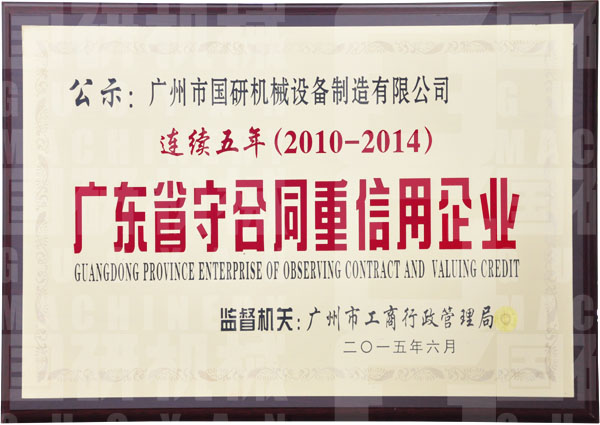 “连续五年(2010-2014)广东省守合同重信用企业”的牌匾在广州市星空体育在线(中国)唯一官方网站设备制造有限公司的文化展示墙上格外引人注目,这是对公司多年坚持诚信经营的充分肯定,也是公司企业文化“诚信、创新、分享、精进”的客观体现。