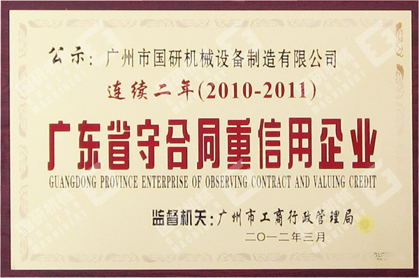 2012年3月,广州市星空体育在线(中国)唯一官方网站设备制造有限公司被评为2011年度“广东省守合同重信用企业”。这是我司继连续三年被评为“广州市守合同重信用企业”之后,连续两年获此殊荣。